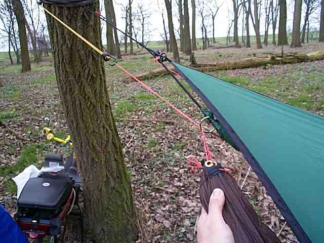 Meine Baumgurte, die die Rinde schonen sollen, sind noch zu kurz (1,8m!), dabei habe ich mir schon die dünnsten Bäume ausgesucht. Diese Baumgurte sind bei den aktuellen Modellen von HH schon dabei. Meine HH ist ein älteres Modell, 'The original HH', da waren die noch nicht dabei. Ich habe sie mir aus alten Sicherheitsgurten selbst gefertigt.