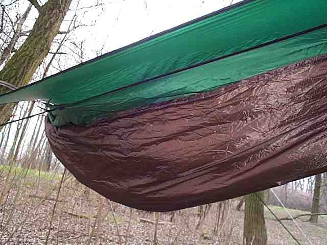 Bei der einen wurde die seitliche Abspannung der Hängematte nicht verwendet und die Unterbodenisolierung konnte sich eng um die Hängematte legen. Die Isolierung war dann so breit gestaltet, dass sie den Schläfer wie einen Cocoon einwickelte. Die Amerikaner wollten damit auch immer bei stärkstem Frost noch schlafen.