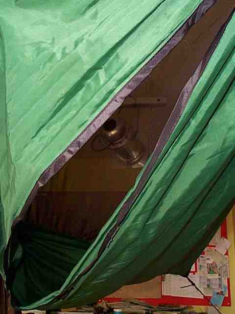 Die Hängematte ist nach oben mit einem Bugnet (Ungeziefernetz, Mücken- oder auch Moskitonetz) vollständig geschlossen. (Das Bild ist in meiner Wohnung entstanden.)