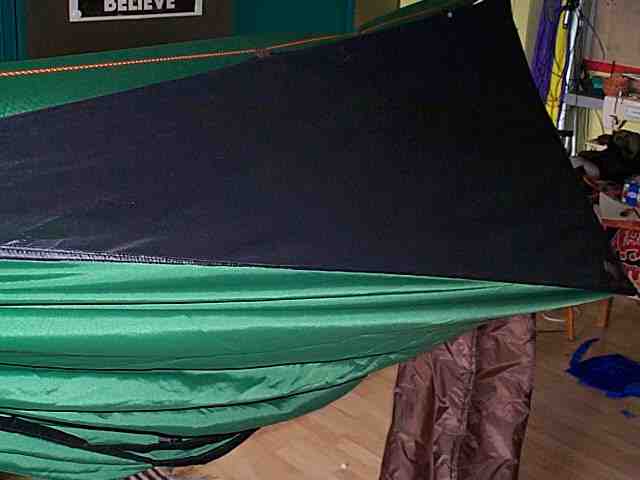 Fertig. Nicht nur das Dach, 'Fly' genannt, sondern auch die Hängematte selbst wird mit Schnüren seitlich abgespannt. Das ergibt ein gewisses Raumgefühl im Inneren der Hängematte.