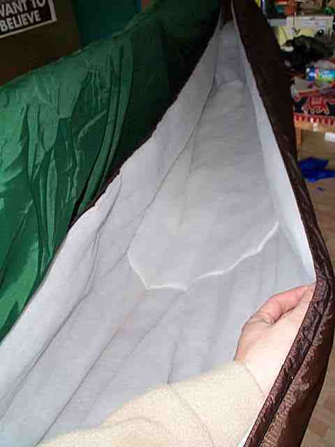 Irgendwann bin ich dann auf die Idee gekommen, die Unterisolierung nur einen Meter breit zu machen und nicht seitlich zu befestigen. Mit ein bisschen Detailarbeit entstand dann das Ergebnis, wie auf dem Foto oben und unten zu sehen: Die Nusschale legt sich gemütlich eng um die Hängematte!