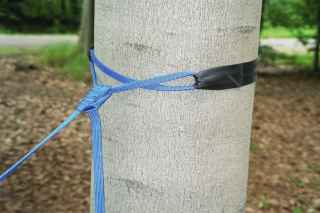 Die Hängematte wiegt 700g mit Befestigungsgurten. Dadurch, dass die Hängematte selbst schon schmale Gurte statt Seile zur Befestigung hat, sind eigentlich keine Baumgurte zum Schutz der Baumrinde mehr erforderlich. Dennoch habe ich mir ein paar kurze Gurte gemacht.