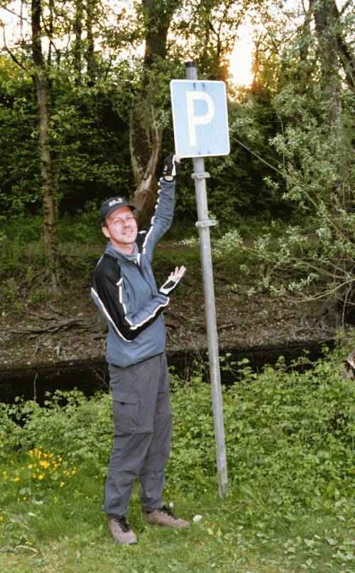 Parkplatz mitten im Grünen? Na jedenfalls sieht man hier meine Klamotten: Basecap, Jacke Gore N2S Phantom, Funktions-Trekkinghose Zip-off, leichte Joggingschuhe und 'klassische' Fahrradhandschuhe. In Verbindung mit einer leichten Windjacke reicht diese Ausstattung ab 5°C aus.