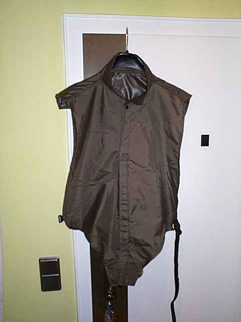 Diese selbstgemachte Regenweste ist gerade eben fertig geworden. Sie ist hinten ganz offen, wiegt 100g und ist aus wasserdicht beschichtetem Nylon gemacht, das sehr robust ist (Zeltplane aus dem Militärbereich). Ein leichteres Material hätte auch gereicht, ich hatte aber nun mal dieses rumliegen. Sie wird einfach über den Kopf gestülpt und unten durch einen Riemen gehalten.