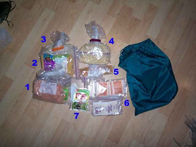 Kochfutterbeutel: 1= Tütensuppen, sortenweise in grosse Beutel umgefüllt, 2= Mung Dal, halbierte und geschälte Mungobohnen, 3= Reis, 4= Couscous, 5= indische Gewürzmischung, 6= Yogi-Tee Classic und Sweet Chai, 7= Salatfix