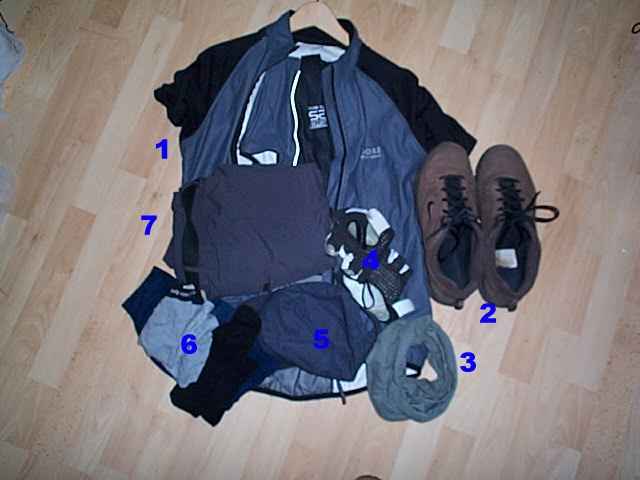 Klamotten, die ich bei Tourenstart normalerweise trage: 1= Gore-Jacke, 2= Laufschuhe, 3= Halstuch, 4= kurze Handschuhe, 5= Basecap, 6= Wäsche, 7= Zipp-off-Hose