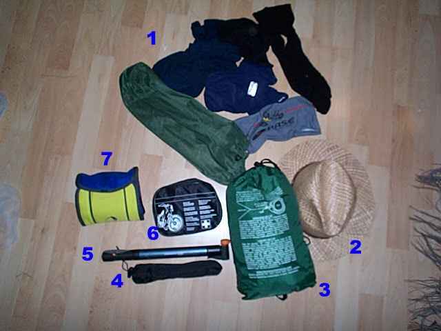 1= Moskitonetz (grün) als Wäschesack und Wäsche, 2= Strohhut als Sonnenschutz, 3= Regenkleidung im Beutel, 4= Heringe, 5= Luftpumpe, 6= Reparaturset fürs Rad, 7= Travelkit Kulturbeutel