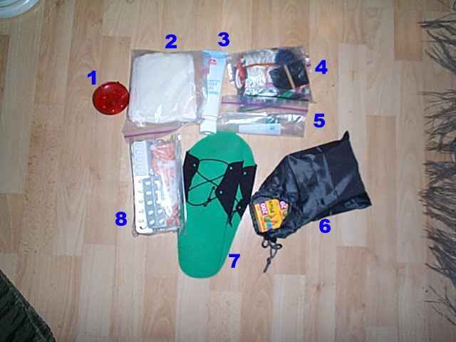 Kleinteile-Beutel: 1= LED-Rücklicht auch als Leselampe, 2= Toilettenpapier, Küchentücher und Ersatz-Spültuch im Zippbeutel, 3= Sportsalbe (Aldi), 4= Jede Menge Kleinkram vom Nähzeug bis zum Ersatz-Feuerzeug, 5= Waschmittel für Membrankleidung, 6= Kleinbildfilme, 7= Duschlatschen, 8= Reiseapotheke