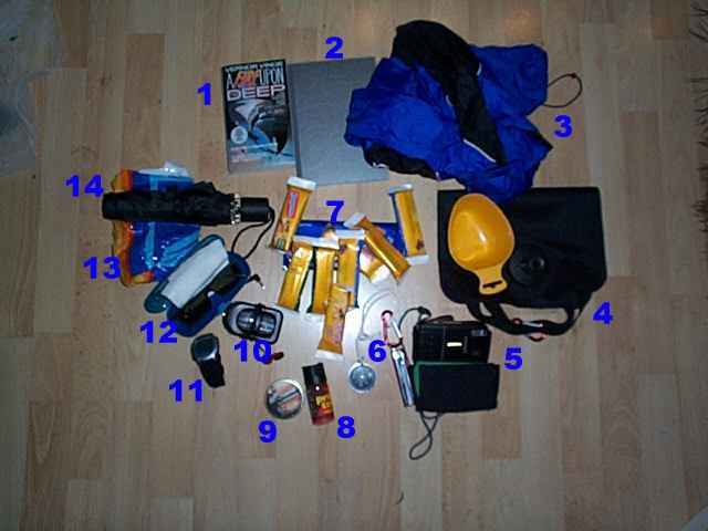 Handbeutel: 1= Roman, 2= Reisetagebuch, 3= Windjacke, 4= Ortlieb-Wassersack 4 Liter und Berghaferl, 5= Kleinbild-Fotoapparat, 6= Schweizer Messer 'Huntsman' und Taschenkompass zusammen am Karabinerhaken, 7= Müsliriegel und Schokolade, 8= Pfefferspray, 9= Mückenschutz 'Nordic Summer', 10= Solarradio, 11= Uhr, 12= Sonnenbrille, 13= Alditüte, da kommt das alles rein als Regenschutz, 14= Regenschirm