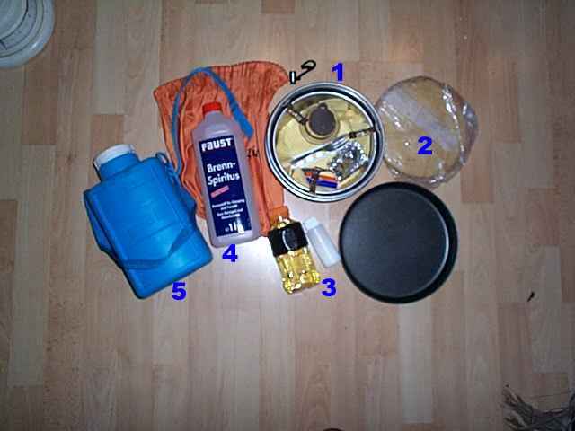 Trangia-Set: 1= Trangiakocher mit Brenner, Spültuch, Besteck, Feuerzeug und Alufolie, 2= Fladenbrote, 3= Speiseöl und Salz passen auch noch in das Set rein, 4= Brennspiritus, 5= Isolierflasche 1 Liter