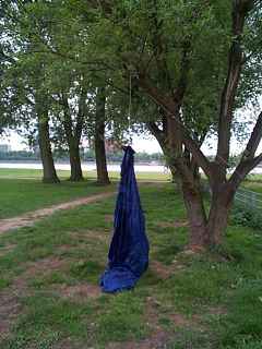Im Zentrum ist ein Packsack direkt eingenäht. Dieser wird mit der Zentralschnur an einen Baumast gehängt. Alternativ kann auch eine Stange mittig aufgestellt werden, wenn man eine passende findet.