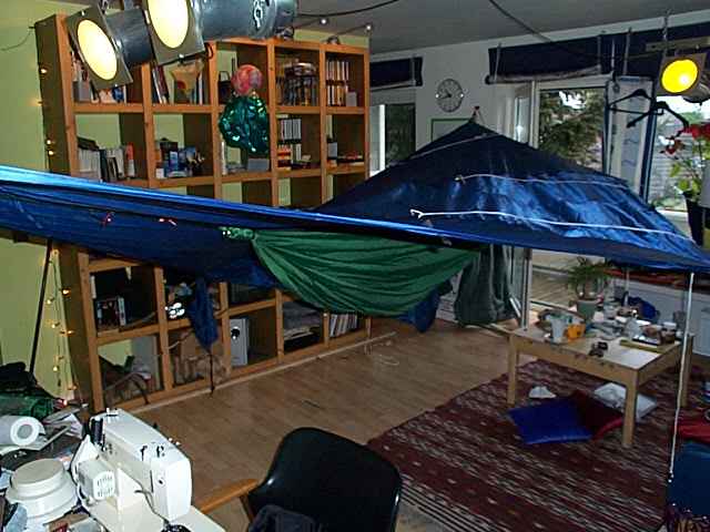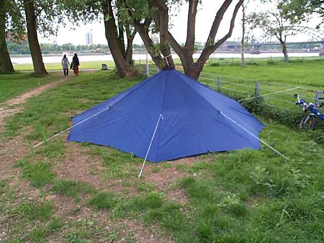 Zu Hause habe ich das dann als Fly für meine Hängematte angepasst. Es passte kaum in mein Wohnzimmer. Ein Segment lässt sich seitlich bis zum Boden abspannen. Genial! Die Befestigung ist dabei genau wie bisher. Also jeweils am Kopfende und Fussende einhaken und seitlich abspannen. Zusätzlich sind zwei der seitlichen Abspannschnüre, die ich für die Verwendung als Tipi angebracht habe, bestens geeignet, um das Fly in der Mitte noch nach oben hin abzuspannen, z.B. an einem überhängenden Ast. Das gibt mehr 'Luft', bis hin zur vollen Stehhöhe!