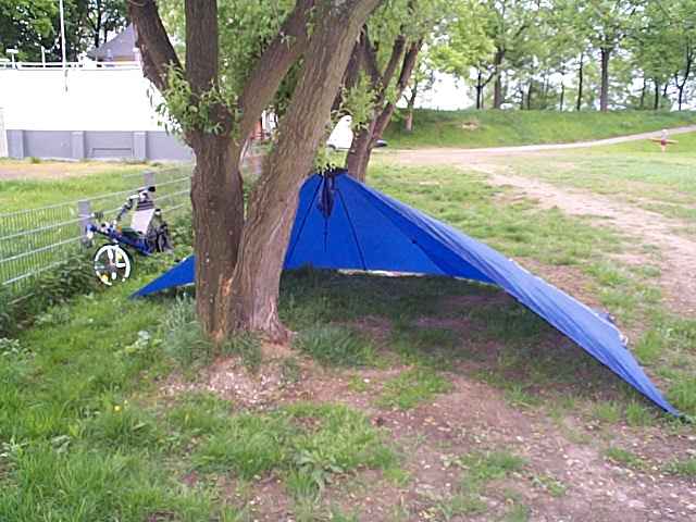 Es ist trotzdem nicht so einfach, die richtige Höhe und Abspannpunkte zu treffen. Als Öffnung ist eine der Ecknähte über die ganze Länge mit Klettband versehen.