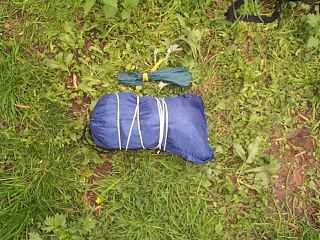Dann einfach den Sack umstülpen und das Tarp mit vier Heringen abspannen.