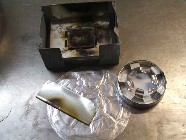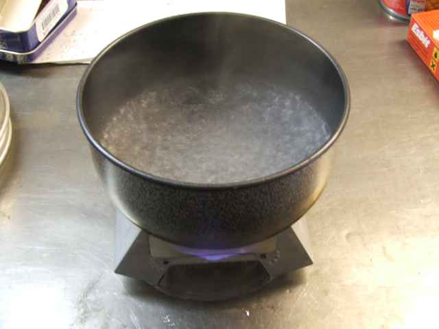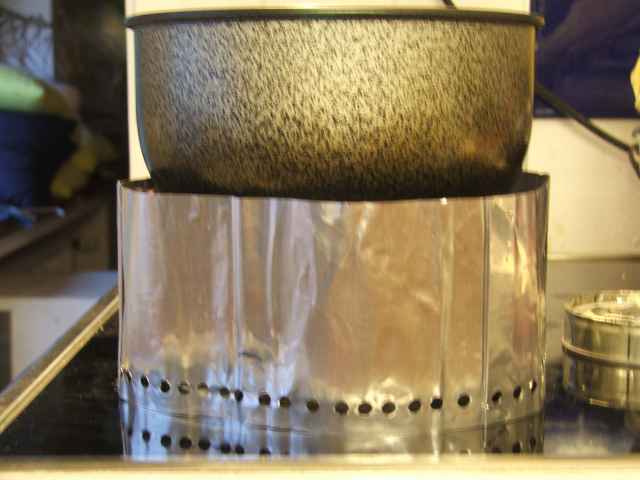 Der Ofen mit dem Spiritusbrenner in einer ersten Version: Der Brenner war viel zu gross. Er brachte zwar einen halben Liter Wasser in 5 Minuten zum Kochen, aber dann war der Spiritusvorrat auch schon verbraucht.