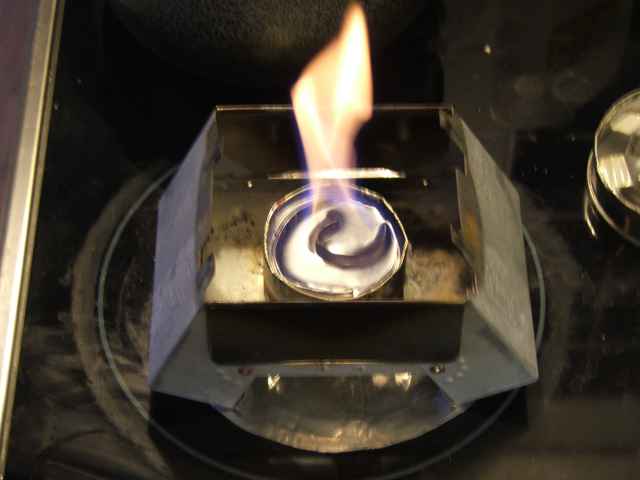 Der zweite Brenner ist viel kleiner. Innen drin liegt lose eine Spirale aus einem Blechstreifen. Sie dient dazu, die Hitze der Flamme zurück in den Spiritus zu leiten. Dadurch kocht der Spiritus und brennt stärker. Den Brenner habe ich randvoll gefüllt. Er brannte dann 12 Minuten und nach 5 Minuten kochte auch hier ein halber Liter Wasser.